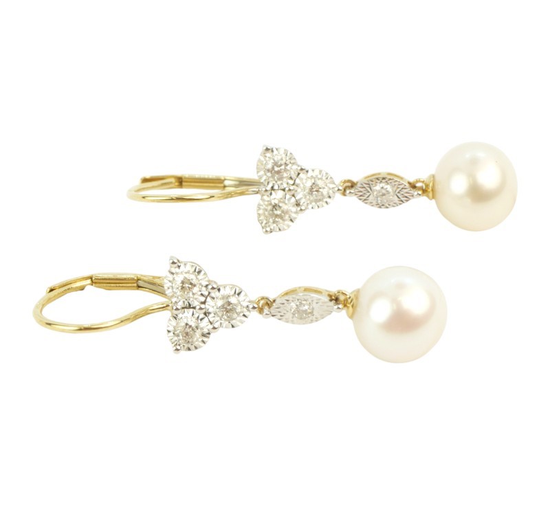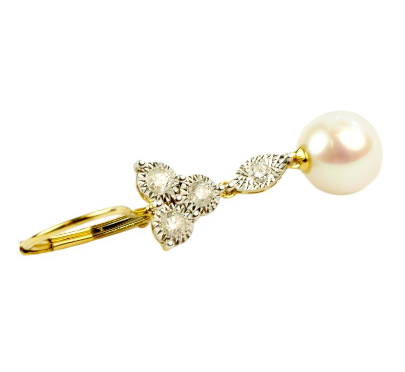 Visací náušnice ze žlutého a bílého zlata ryzosti 585/1000 jsou osazeny perlami a diamanty briliantového brusu o celkové hmotnosti 0,24 ct. Celková hmotnost obou náušnic je 2,73 g. Délka náušnice 3,3 cm.