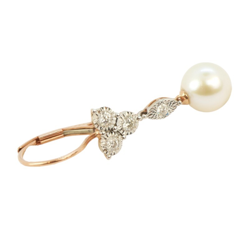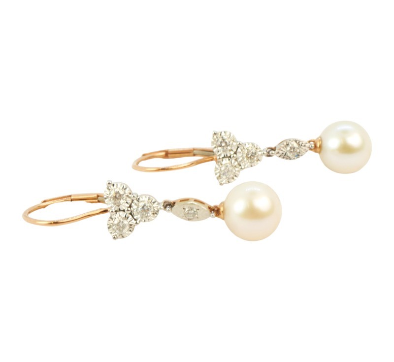 Visací náušnice z růžového zlata ryzosti 585/1000 jsou osazeny perlami a diamanty briliantového brusu o celkové hmotnosti 0,24 ct. Celková hmotnost obou náušnic je 2,89 g. Délka náušnice 3,3 cm.