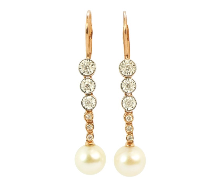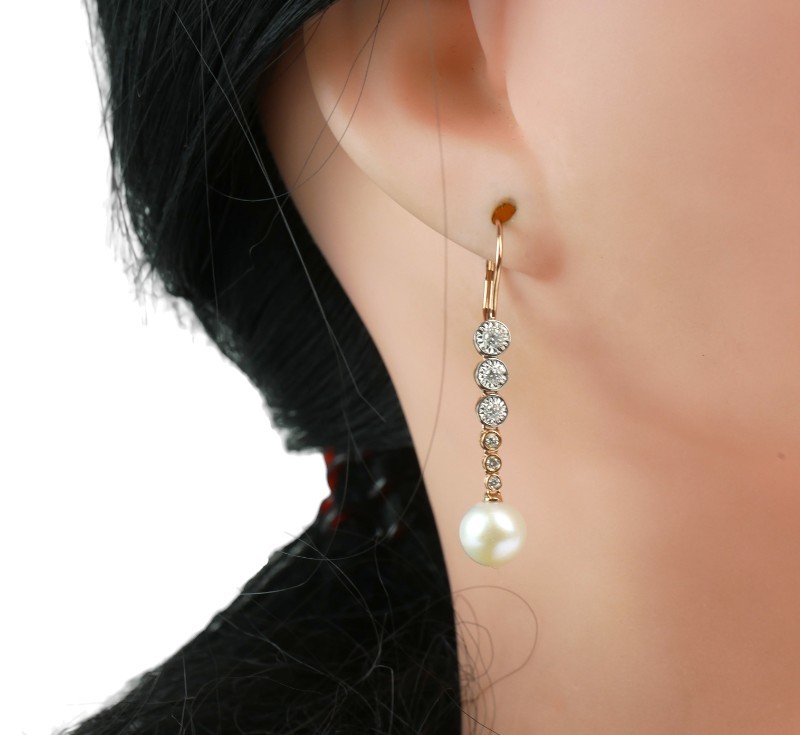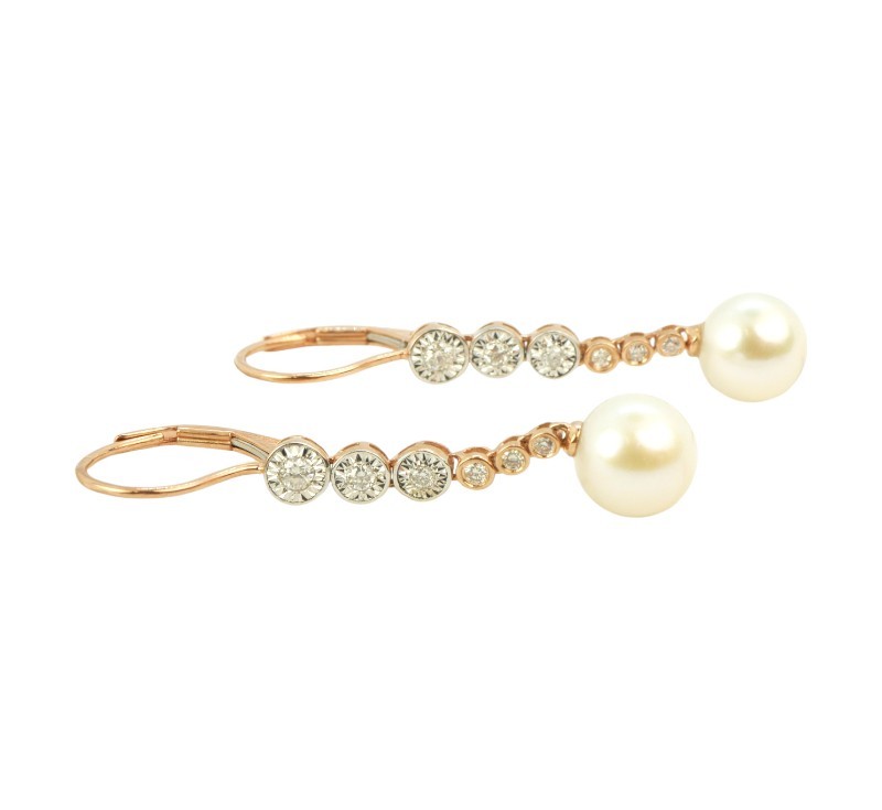Visací náušnice z růžového zlata ryzosti 585/1000 jsou osazeny perlami a diamanty briliantového brusu o celkové hmotnosti 0,20 ct. Celková hmotnost obou náušnic je 3,06 g. Délka náušnice 3,9 cm.