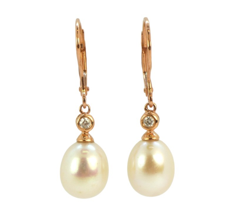 Visací náušnice z růžového zlata ryzosti 585/1000 jsou osazeny perlami a diamanty briliantového brusu o celkové hmotnosti 0,06 ct. Celková hmotnost obou náušnic je 3,47 g. Délka náušnice 3,3 cm.