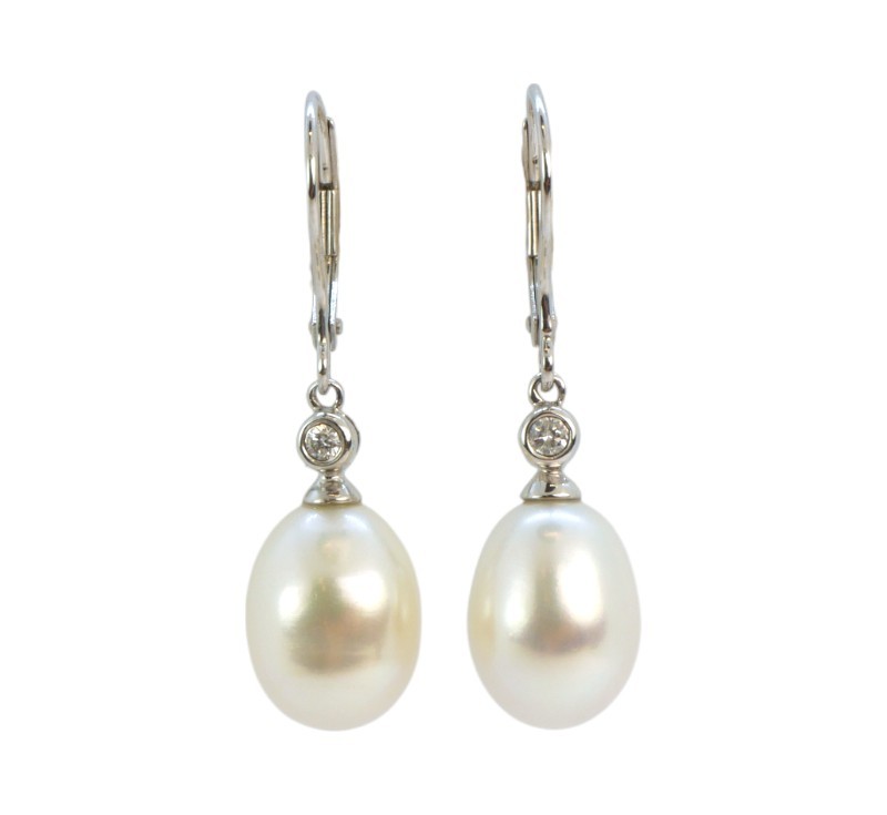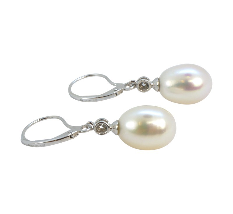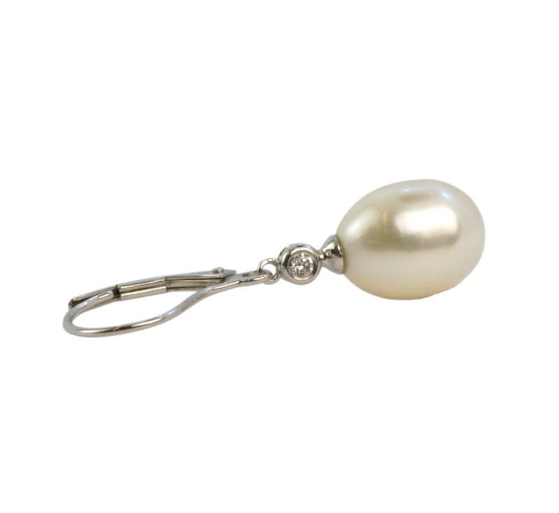 Visací náušnice z bílého zlata ryzosti 585/1000 jsou osazeny perlami a diamanty briliantového brusu o celkové hmotnosti 0,06 ct. Celková hmotnost obou náušnic je 4 g. Délka náušnice 3,4 cm.