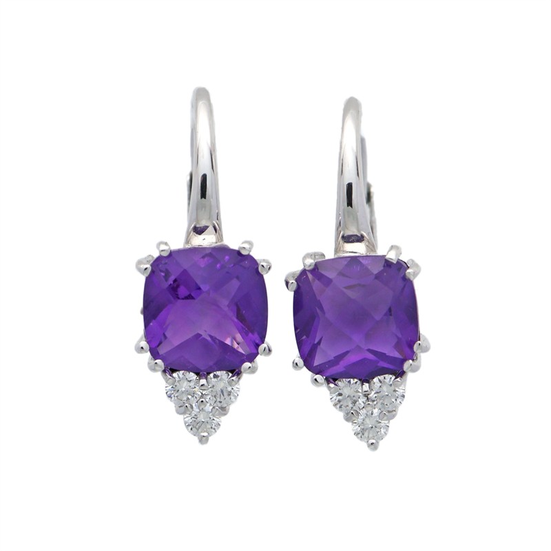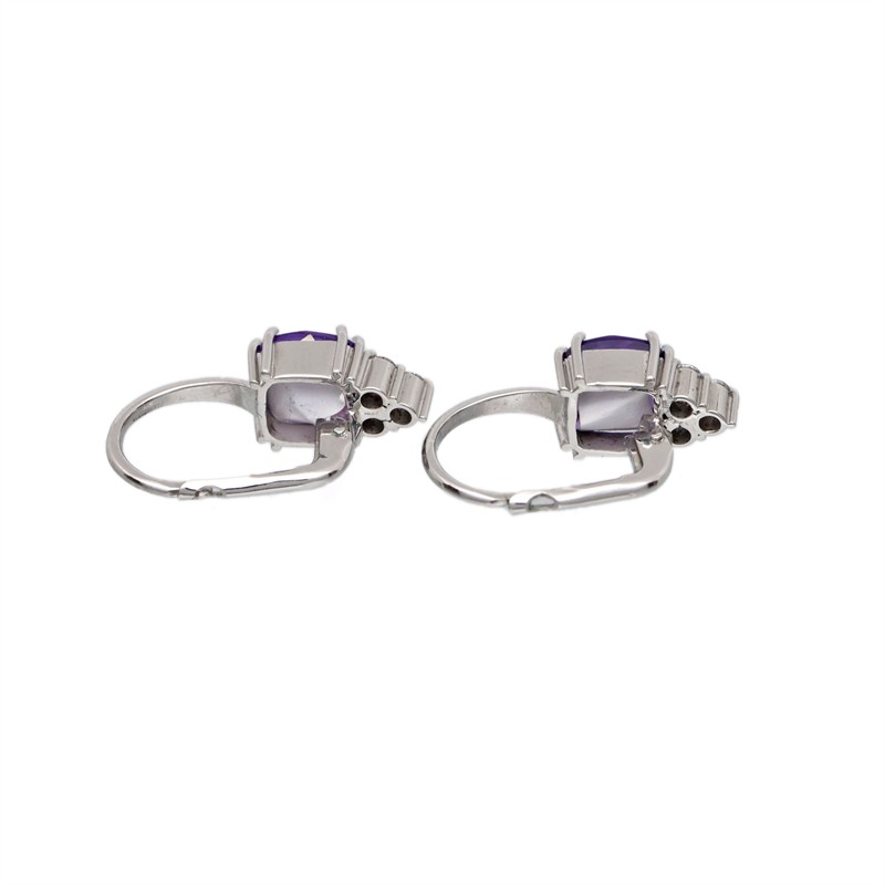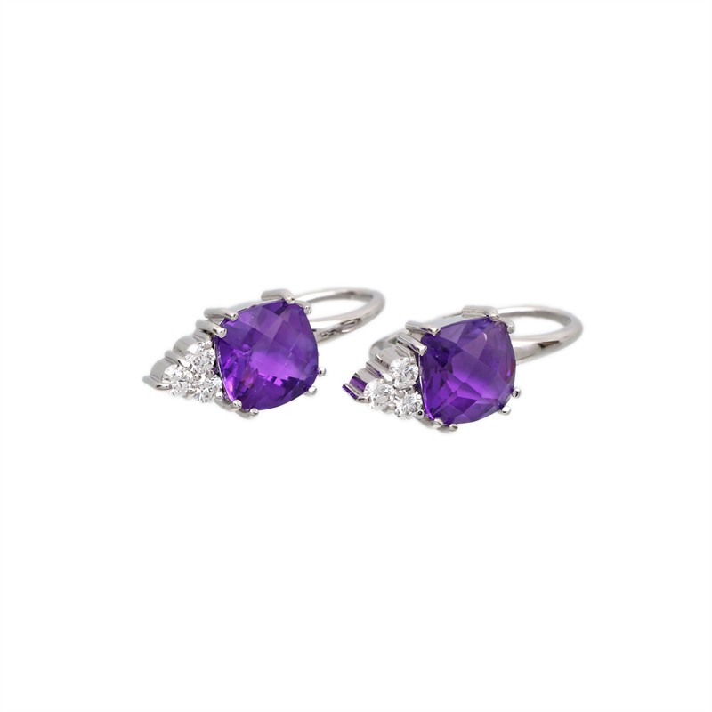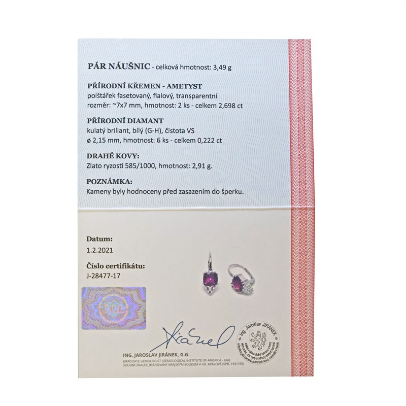 14 karátové bílé zlato 585/1000, celková hmotnost 3,49 g | Přírodní ametyst, fialový, transparentní, 2ks: 2,698 ct | Přírodní diamanty briliantového brusu 6ks: 0,222 ct (bílý G-H, čistota VS) | Výborný stav | Výška náušnice 2 cm | Kameny zkontrolovány v gemologické laboratoři | Přiložen certifikát pravosti ČGL | Zařizujeme veškerý profesionální zlatnický servis - úpravy velikosti, opravy, rhodiování, čištění, výměnu kamenů, znalecké odhady, certifikace a další služby dle vašich potřeb.
