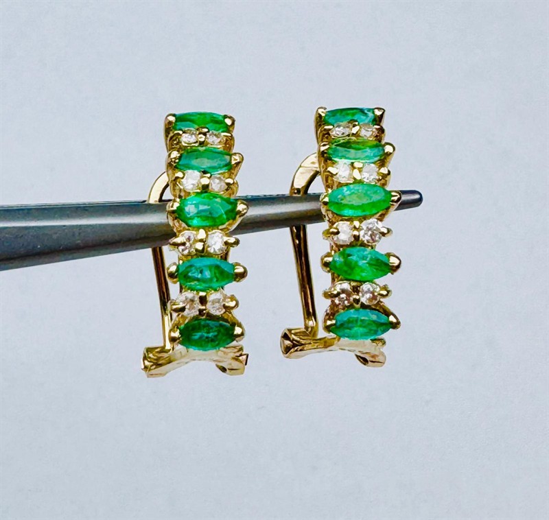 Zlaté náušnice s přírodními smaragdy a diamanty, náušnice jsou vyrobené z zlata 750/1000 a váží 3,3 gramů. Přírodní smaragdy a přírodní diamanty - brilianty. Rozměr 16x7 mm.