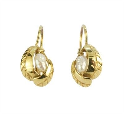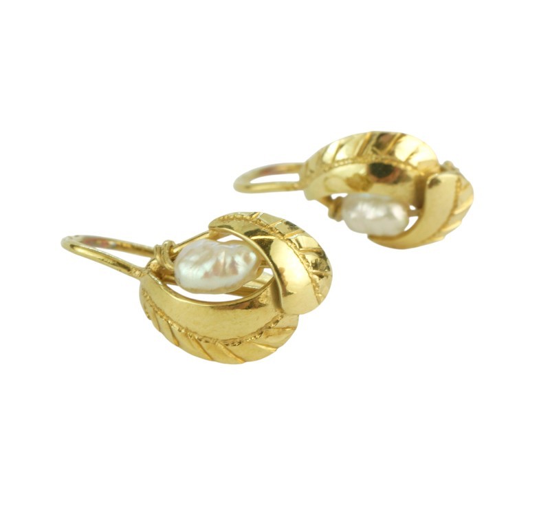 Náušnice ze žlutého zlata ryzosti 585/1000 s říčními perličkami. Celková hmotnost obou náušnic je 2,60 g. Délka náušnice je 1,9 cm.