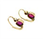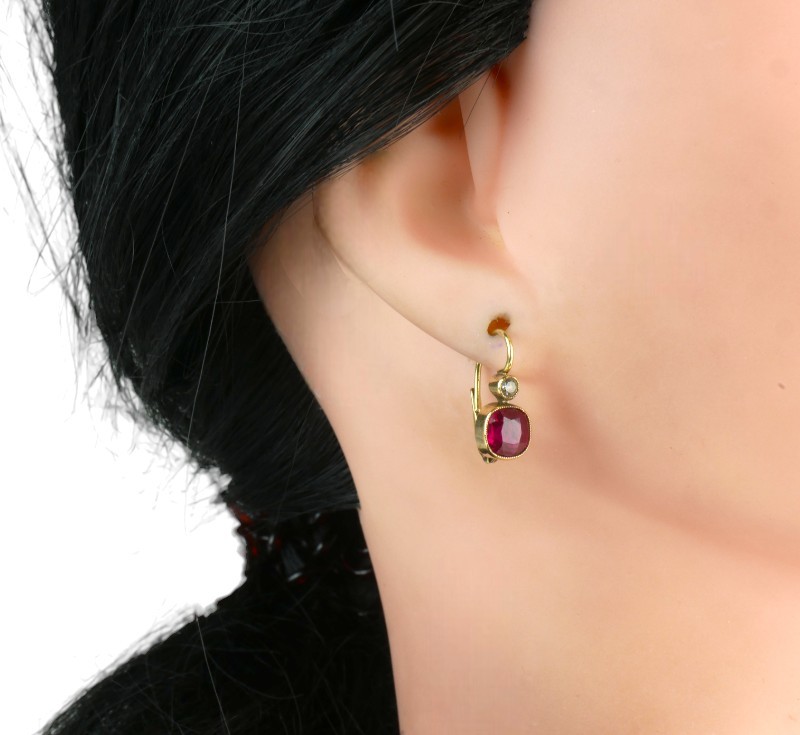 Starožitné náušnice z konce 19. století vyrobené ze zlata ryzosti 585/1000 zdobené syntetickými rubíny a leukosafíry, Rozměry 1,0 x 0,6 cm. Celková hmotnost 2,58 g. Punc liška.