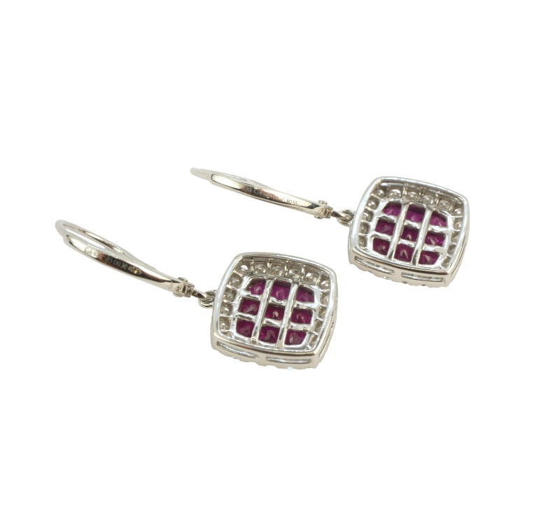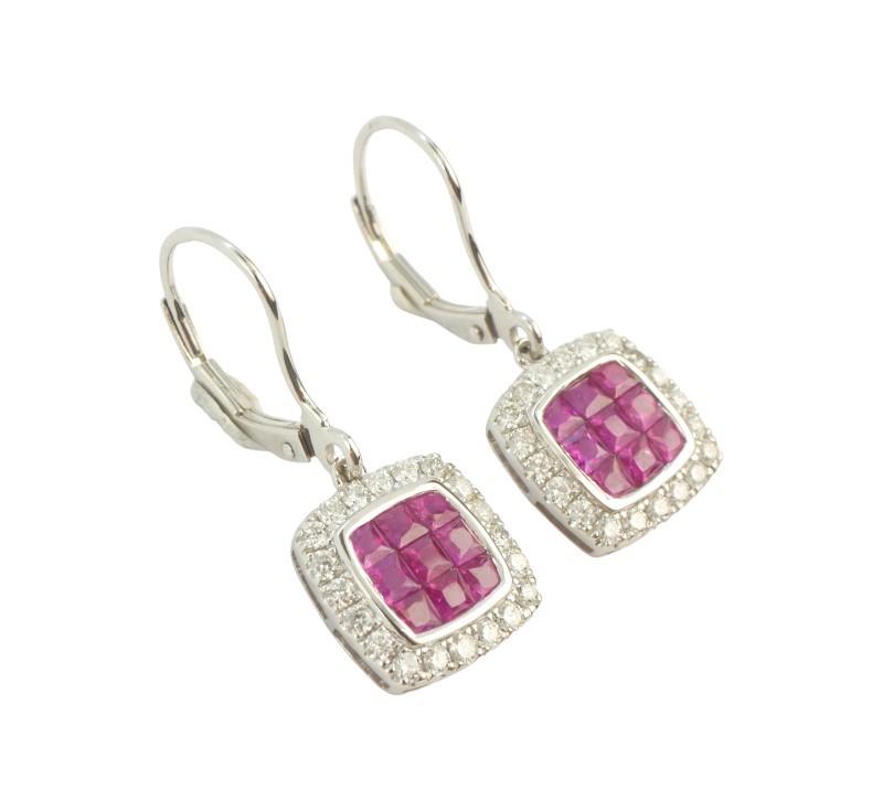 Náušnice z bílého zlata ryzosti 585/1000 s rubíny a diamanty briliantového brusu o celkové hmotnosti 0,60 ct. Celková hmotnost obou náušnic je 3,05 g. Rozměry ověsné části 1,1 x 1,1 cm.