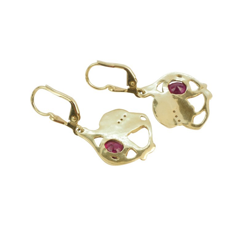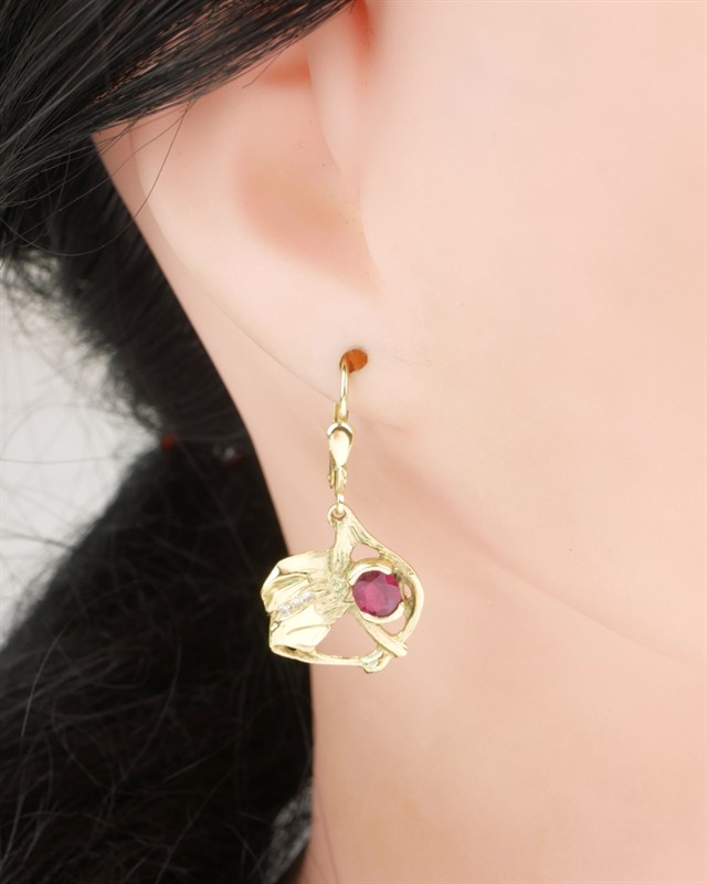Náušnice ze žlutého zlata ryzosti 585/1000 (punc labuť) v secesním stylu s rubíny celkové hmotnosti 1,39 ct a drobnými diamanty. Délka náušnice je 3,4 cm. Celková hmotnost obou náušnic je 4,90 g. K rubínům thajský certifikát.