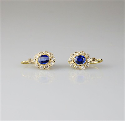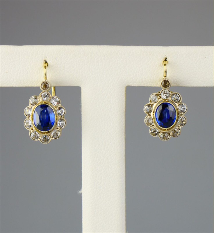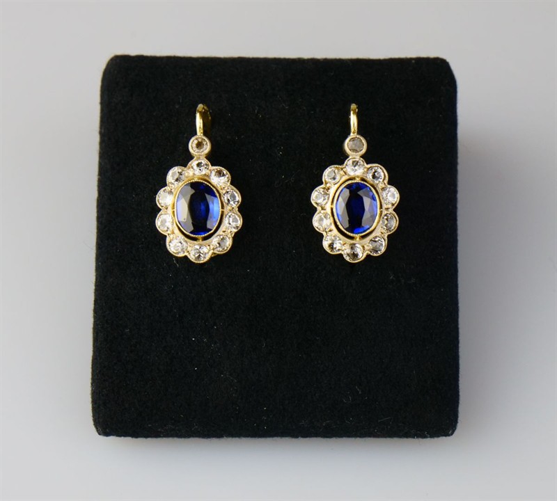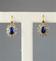 zlaté náušnice se syntetickým modrým safírem a bezbarvými leukosafíry, kameny vsazené ve stříbře, Au btto 2,95 g/585/1000, Rakousko, kolem r. 1930, dobový rakouský punc a československý dovozový punc (lyra); rozměry 1,9 x 1,3 x 1 cm