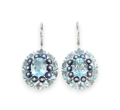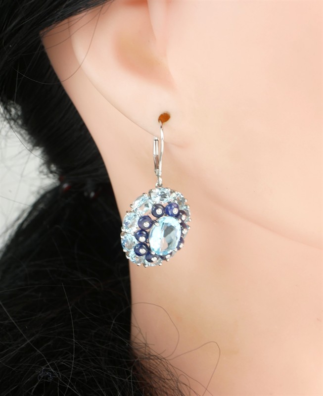 Náušnice z bílého zlata ryzosti 585/1000 se safíry, topazy a diamanty briliantového brusu o celkové hmotnosti 0,10 ct. Celková hmotnost obou náušnic je 8,95 g. Rozměry ověsné části 2,2 x 2 cm.