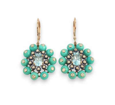 Náušnice z růžového zlata ryzosti 585/1000 se safíry, topazy, tyrkysy a diamanty briliantového brusu o celkové hmotnosti 0,36 ct. Celková hmotnost obou náušnic je 8,50 g. Rozměry ověsné části 2,3 x 2,1 cm.