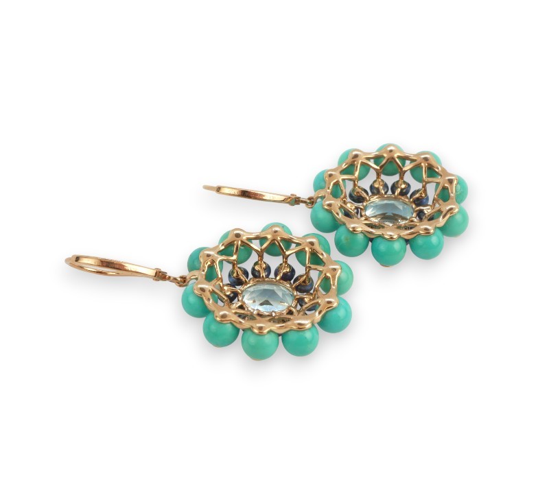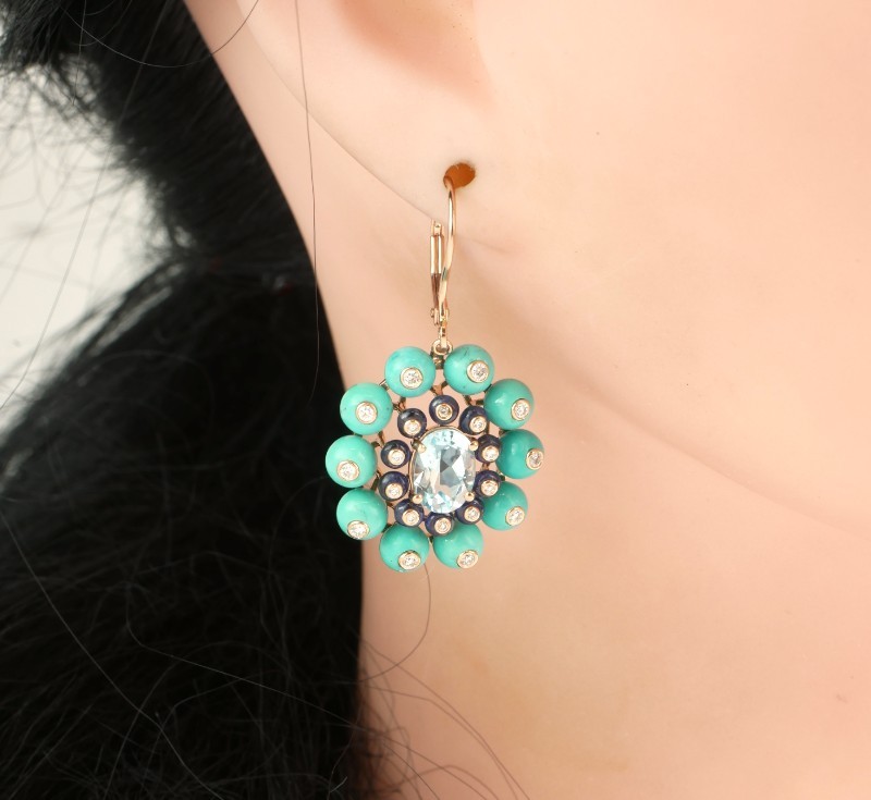 Zlaté náušnice s tyrkysy, topazy, safíry a diamanty