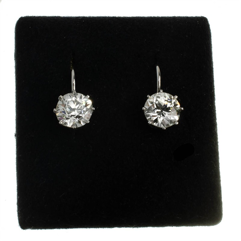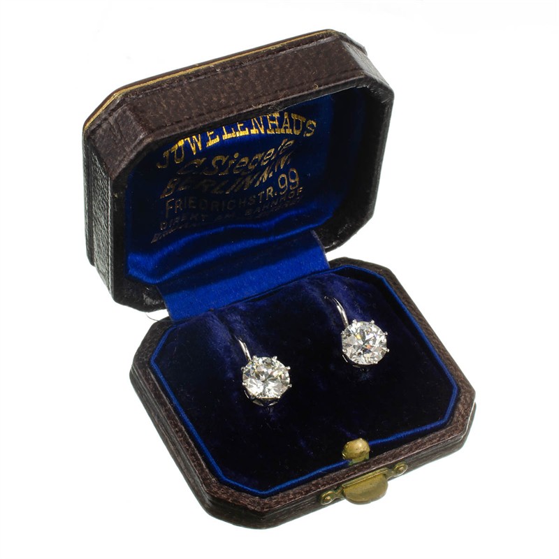 Náušnice z bílého zlata s diamanty briliantového brusu mimořádné kvality o celkové velikosti 3,26 ct. K dispozici je posudek od dr. Hyršla, kde jsou popsány jednotlivé kameny: 1x 1,57 ct kvality IF ,barvy K-L, 1x 1,69 ct kvality VS1, barvy K-L. Au 585/1000, hmotnost: 2,31 g, Rozměry: 15,1 x 8,2 x 12 mm, průměr briliantů 7,5 a 7,4 mm. Čechy, 40. léta 20. století