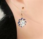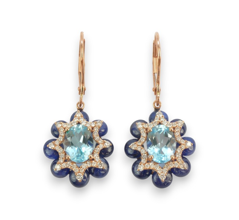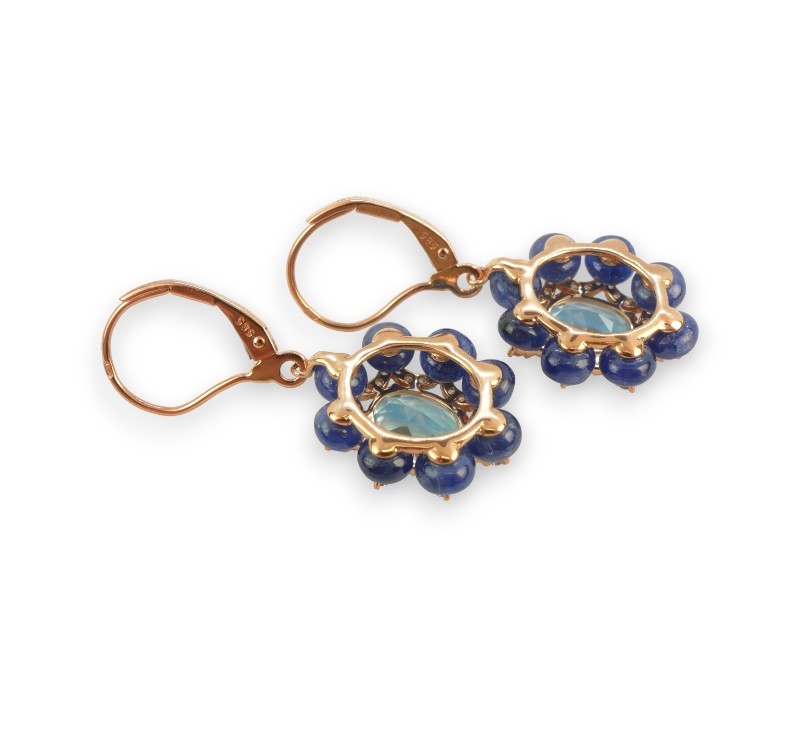 Náušnice z růžového zlata ryzosti 585/1000 se safíry, topazy a diamanty briliantového brusu o celkové hmotnosti 0,44 ct . Celková hmotnost obou náušnic je 5,48 g. Rozměry ověsné části 1,7 x 1,5 cm.