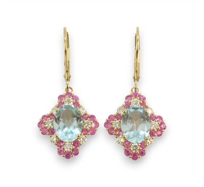 Náušnice ze žlutého zlata ryzosti 585/1000 s růžovými safíry, topazy a diamanty briliantového brusu o celkové hmotnosti 0,60 ct. Celková hmotnost obou náušnic je 4,27 g. Rozměr ověsu 16 x 15 mm, délka 3,2 cm.