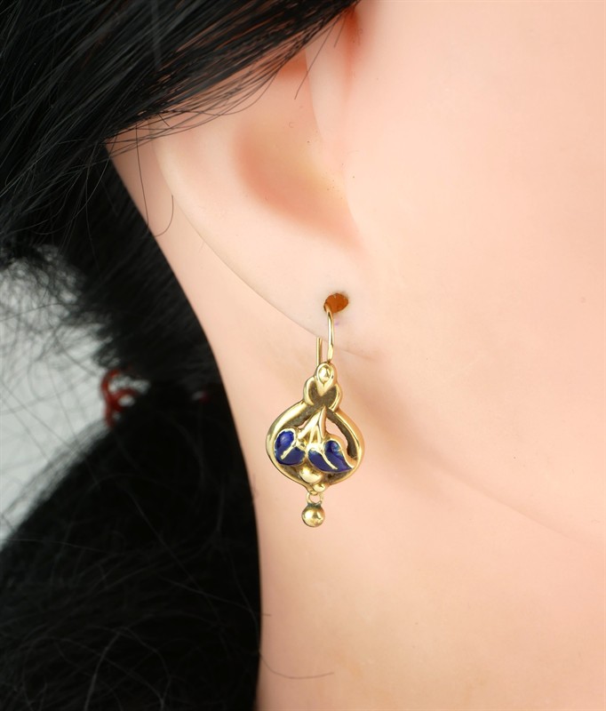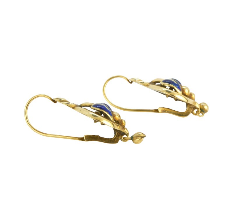 Náušnice ze žlutého zlata ryzosti 585/1000 (punc liška) zdobené kobaltově modrými smalty. Rozměry 2,5 x 1,3 cm, celková hmotnost náušnic 2,15 g.