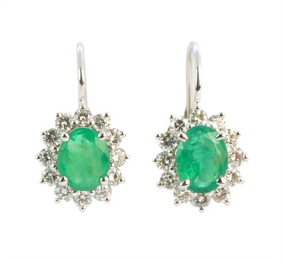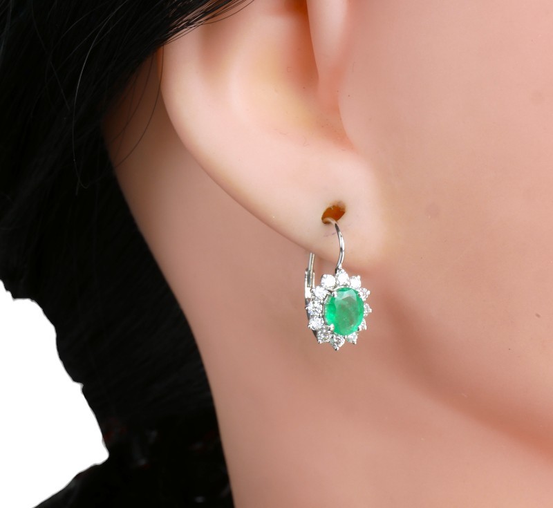 Náušnice z bílého zlata ryzosti 585/1000 jsou osazeny smaragdy a diamanty briliantového brusu o celkové hmotnosti 0,56 ct. Celková hmotnost obou náušnic je 2,03 g. Rozměry ověsu 10 x 9 mm.