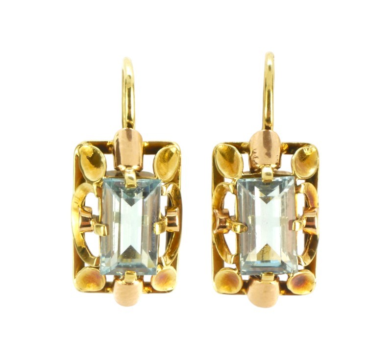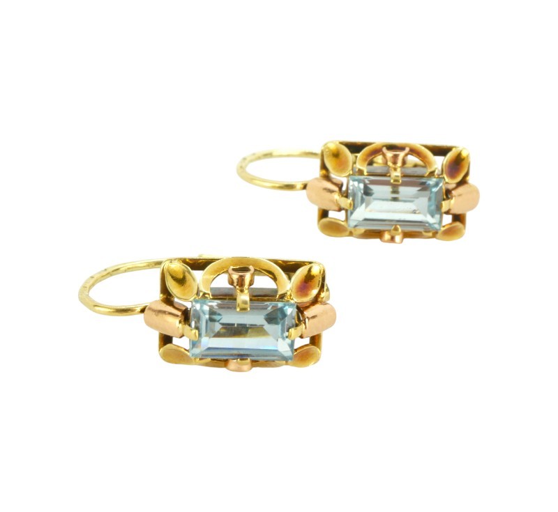Náušnice vyrobené z kombinace žlutého a růžového zlata ryzosti 585/1000 zdobené spinely. Rozměry 1,3 x 0,8 cm. Celková hmotnost 2,70 g .