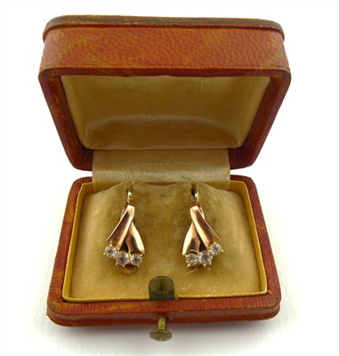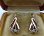 Čtrnáctikarátové zlato, syntetické leukosafíry. Ryzost Au 585/1000, celková hmotnost 2,40 g. Zlaté visací náušnice zajímavého tvaru evokující obrácený zvonkový květ zakončený syntetickými leukosafíry. Zapínání na dámský patent (klapku) . V originální etui ze světlé přírodní kůže. Značeno: československý punc lvíček, ryzost 585 a mistrovská značka. Československo 1929 - 1949. Výška 20 mm, šířka 10 mm.