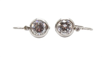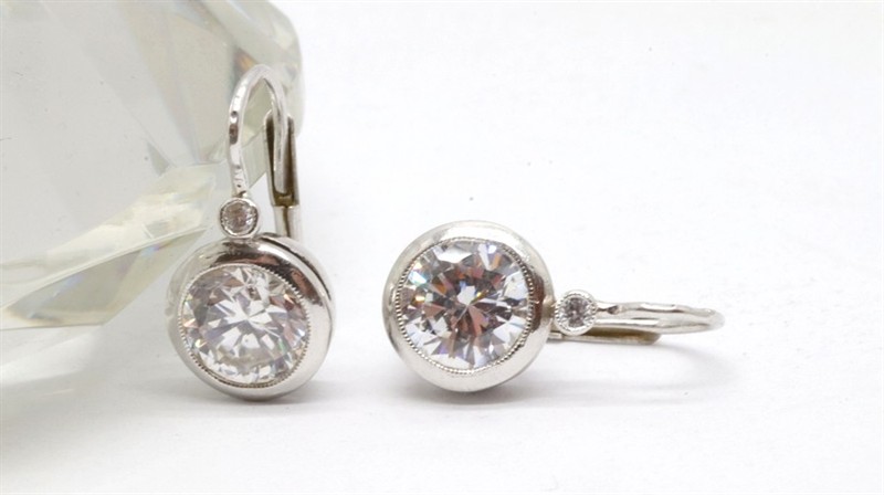 Zlaté náušnice se zirkony. Žluté zlato 585/1000. Kubické zirkony, celková váha 2,3 ct. Váha náušnic: 3,14 g. Rozměr: 1,5 cm x 0,9 cm.