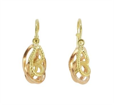 Náušnice jsou zhotovené v kombinaci žlutého a růžového zlata ve tvaru uzlů a mají ryzost 585/1000 a jejich celková hmotnost je 3 g. Délka náušnice je 2 cm.