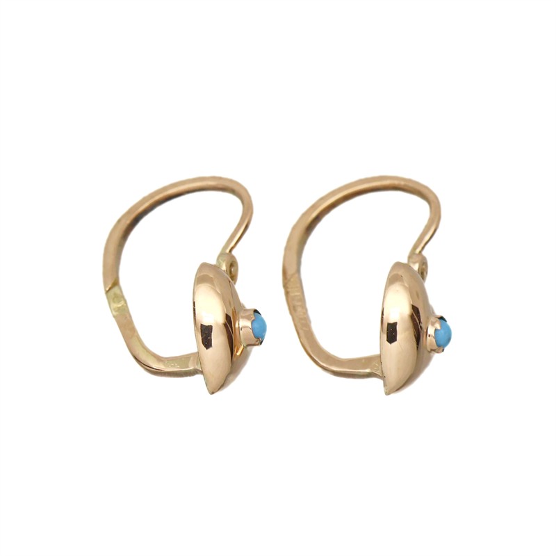 14 karátové zlato 580/1000, celková hmotnost 0,67 g | Dětské náušnice | Výška 0,8 cm | Přírodní tyrkysy | Punc liška | Rakousko-Uhersko | Výborný stav | Zařizujeme veškerý profesionální zlatnický servis - úpravy velikosti, opravy, rhodiování, čištění, výměnu kamenů, znalecké odhady, certifikace a další služby dle vašich potřeb.