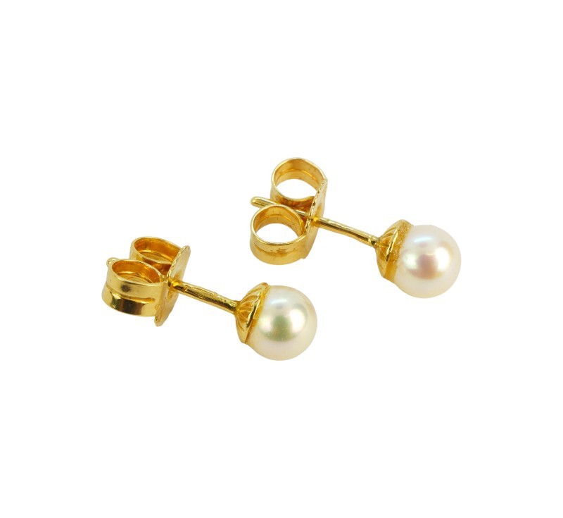 Perlové náušnice ze zlata ryzosti 750/1000 se zapínáním na puzety. Průměr perly 0,5 cm. Celková hmotnost 0,96 g.