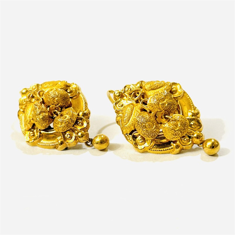Honosné, větší náušnice z období pozdního biedermeieru, hlavice ve tvaru plastické kartuše s jemně rytou aplikací květu s listy, doplněno decentními kuličkovými ověsky. Západoevropská klenotnická práce ze 3. čtvrtiny 19. století. Vyrobeno technikou foukaného kovu. Zhotoveno ze sytě žlutého 19,2 karátového zlata, tj. o ryzosti 800/1000; vyhotoveno osvědčení puncovního úřadu, neznačeno. Hmotnost 6,05 g, celková délka 35 mm, šířka 20,5 mm. Zapínání formou dětské brizury v pořádku, nečištěno, celkově ve velmi zachovalém stavu.