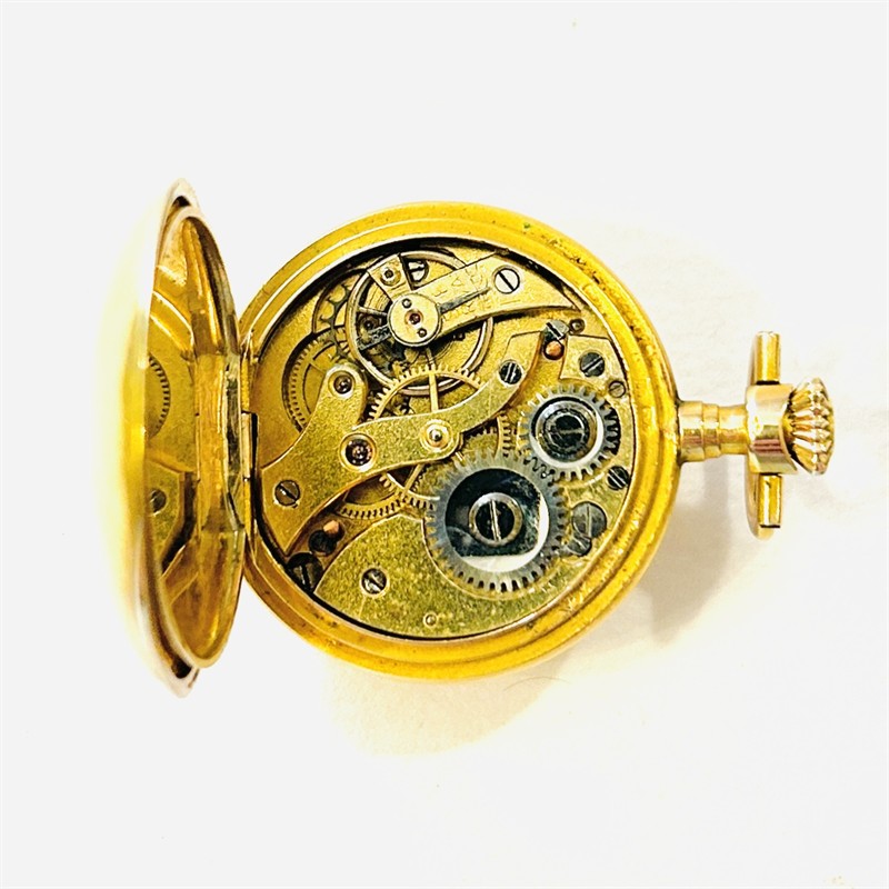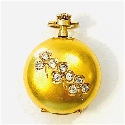 Půvabné tříplášťové dámské kapesní hodinky/jeptišky, přední frontální plášť s motivem 3 trojlístků, jež jsou osazeny přírodními leukosafíry kulatého brusu, zadní plášť ponechán hladký, efektně potaženo matným dukátovým zlatem. Bílý porcelánový číselník s černými římskými číslicemi, decentní zlatavé ručičky (hodinová a minutová). Historický, praktický doplněk, švýcarská hodinářská a zlatnická práce z přelomu 19. a 20. století století dovezená na území monarchie ve stejném období. Plášť, prachovka oblík i korunka zhotoveny z narůžovělého žlutého 14 karátového zlata, tj. o ryzosti 585/1000; rakousko-uherský dovozový punc Z-29 (AV) s písmenem "A" (značící vídeňský puncovní úřad) na krčku, švýcarský punc (veverka), ryzostní a sériová čísla zevnitř plášťů. Hmotnost 16,56 g, délka včetně oblíku 37 mm, šířka 26 mm. Mechanický strojek s válcovým krokem plně funkční v roce 2025 profesionálně vyčištěný. Celkově ve velmi zachovalém stavu.