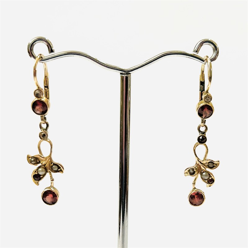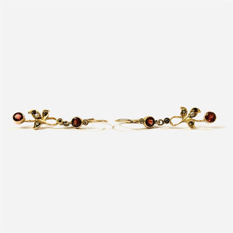 Velice půvabné visací náušnice z období secese, hlavice ve tvaru tradičních "sněhuláků", ověsek ve tvaru stylizovaného listu, osazeno nezvykle pestrou kombinací přírodních almandinů a leukosafírů kulatého brusu, českých granátů a přírodních bílo-šedých perel. Pražská klenotnická práce z počátku 20. století. Zhotoveno z narůžovělého žlutého 14 karátového zlata, tj. o ryzosti 580/1000; rakousko-uherský punc Z-27 (liška 4) s písmenem „C“ (značí pražský puncovní úřad) a mistrovská značka na dřících a ověsku. Hmotnost 2,51 g, celková délka 37,5 mm, šířka 9 mm. Klapkové zapínání v pořádku, jeden dřík v minulosti opravován, jinak v zachovalém stavu, odborně vyčištěno a vyleštěno zlatníkem.