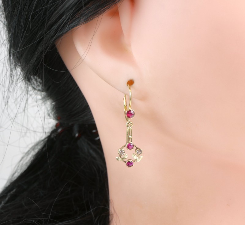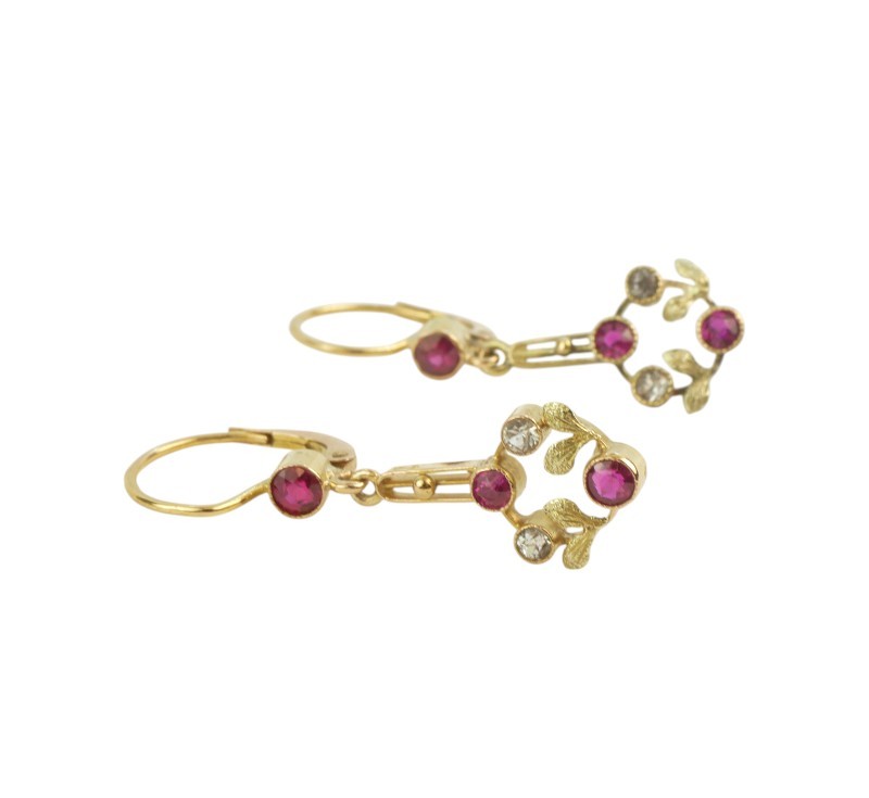 Zlaté secesní náušnice s rubíny a leukosafíry