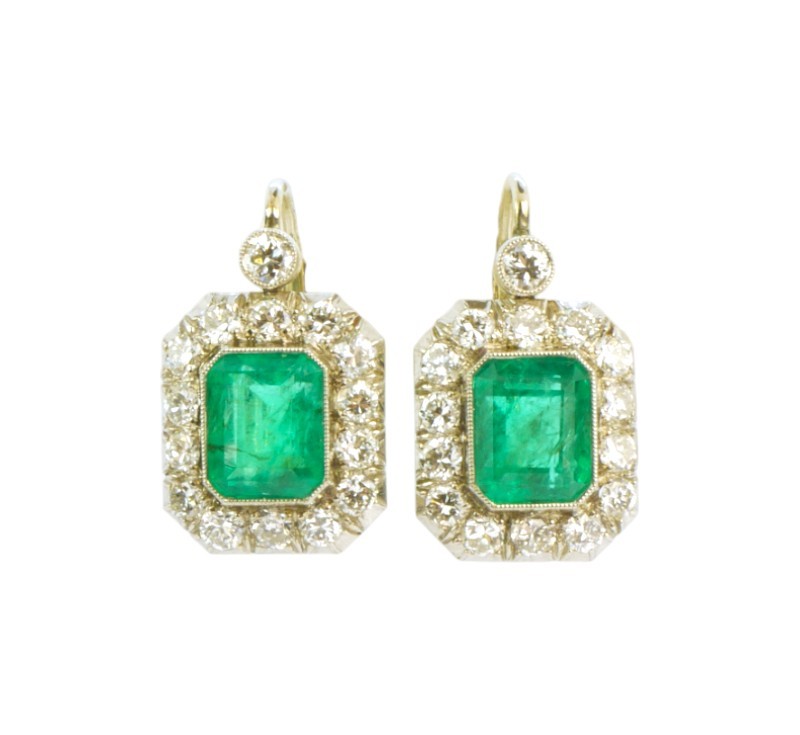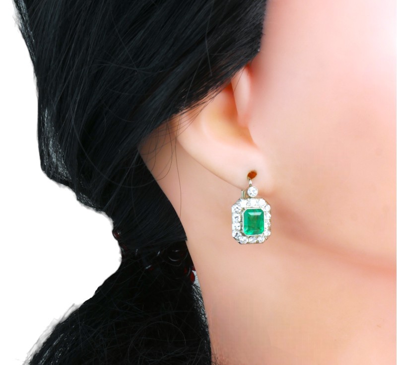 Starožitné náušnice z bílého zlata ryzosti 585/1000 jsou osazeny smaragdy bagetového brusu a diamanty o celkové hmotnosti cca 2,80 ct. Rozměry náušnice jsou 2,1 x 1,3 cm. Celková hmotnost obou náušnic je 5,44 g. Krásná zlatnické práce ,odborně vyčištěno zlatníkem