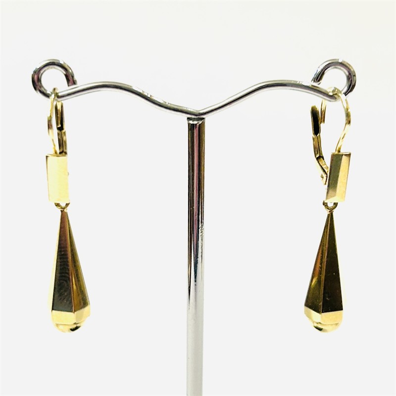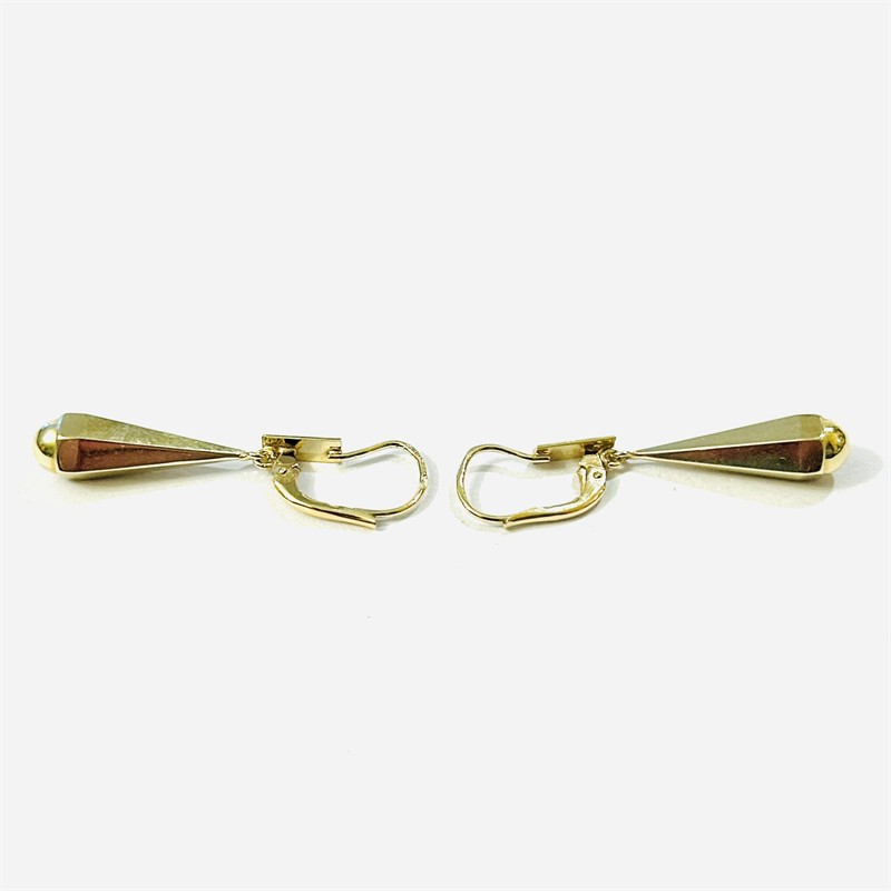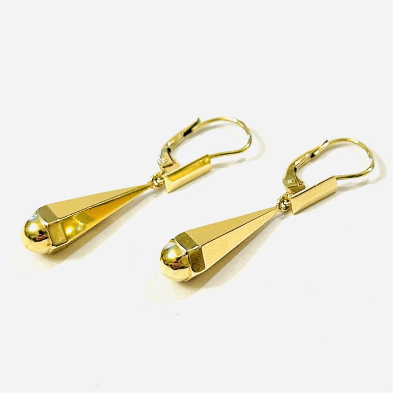 Elegantní visací náušnice v art-deco tvarosloví, ověsky ve tvaru kapky i štít u zapínání s opticky efektními fazetami. Kvalitní tuzemská práce klenotnického družstva Safina ze 70. let 20. století. Zhotoveno ze žlutého 14 karátového žlutého zlata, tj. o ryzosti 585/1000; punc Z-36 (čejka 4), ryzostní číslo a značka výrobce "SAF" na dřících. Hmotnost 2,75 g, celková délka 38 mm, šířka 6 mm. Klapkové zapínání v pořádku, celkově ve velmi zachovalém stavu, odborně vyčištěno a vyleštěno zlatníkem.