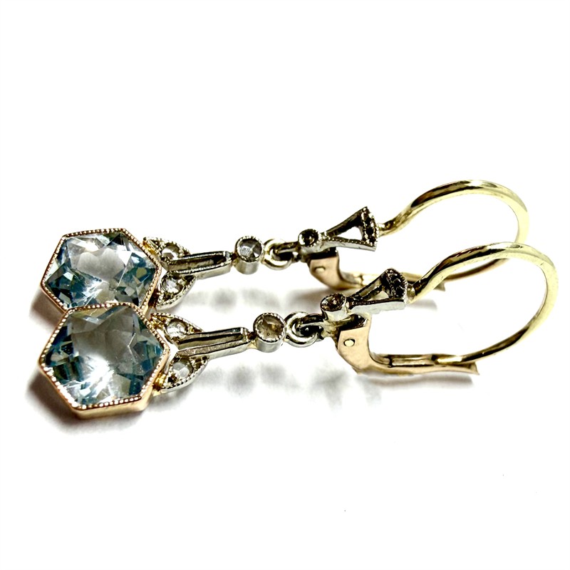 Jemné, prvorepublikově decentní, závěsné náušnice. Šperku dominuje kinetický ověs osazený akvamarínem fazetového brusu. Náušnice byly zhotoveny v období první republiky v kombinaci zlata bílého a žlutého odstínu. Kombinace ryzosti 585/1000, 490/1000 a 333/1000. K šperku je zhotoveno osvědční puncovního úřadu. Celková váha 1,42 g. Délka 2,8 cm. Profesionálně vyčištěno zlatníkem. Půvabný šperk vhodný k dennímu užití i slavnostní příležitosti je v perfektním stavu. Krabička není součástí prodeje.