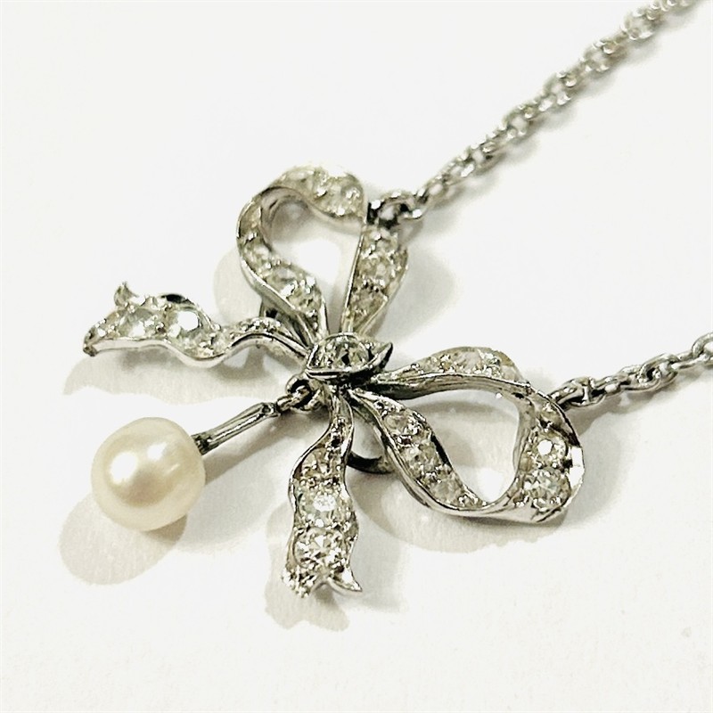 Půvabný, jemný náhrdelník z období secese, ozdobná část ve tvaru stylizované mašle osázená přírodními diamanty kulatého jednoduchého brusu (achtkant) o celkové váze 0,49 ct (23 ks), jejichž kvalita je dobrá, v ověsku osazeno bílou perlou o průměru 4,5 mm, u níž není vyloučen přírodní-divoký původ. Západoevropská klenotnická práce z počátku 20. století. Spodní část závěsu zhotoveno z bílého 15,1 karátového zlata, tj. o ryzosti 630/1000, zapínání ze 14 karátového, tj. o ryzosti 585/1000, uložení kamenů a řetízek z platiny o ryzosti 950/1000; vyhotoveno osvědčení puncovního úřadu, ryzostní číslo na zapínání. Hmotnost 6,25 g, celková délka 41 cm, ozdoba 22 mm, šířka vazby 1,5 mm, ozdoba 19 mm. Jazýčkové zapínání včetně "8" pojistky v pořádku, celkově ve velmi zachovalém stavu, odborně vyčištěno a vyleštěno zlatníkem. Součástí odborný posudek.