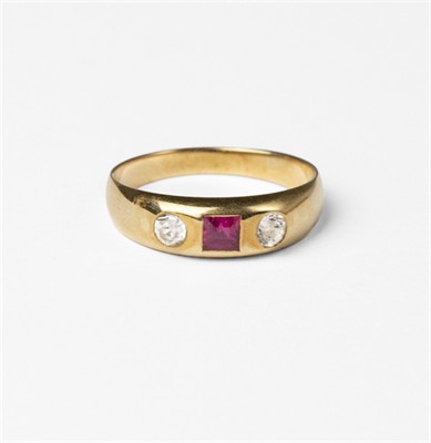 zlatý alianční prsten s leukosafíry starého briliantového brusu a syntetickým rubínem, Au 3,59 g/580/1000, Čechy, kolem roku 1910, puncováno (liška), velikost prstenu 58,5