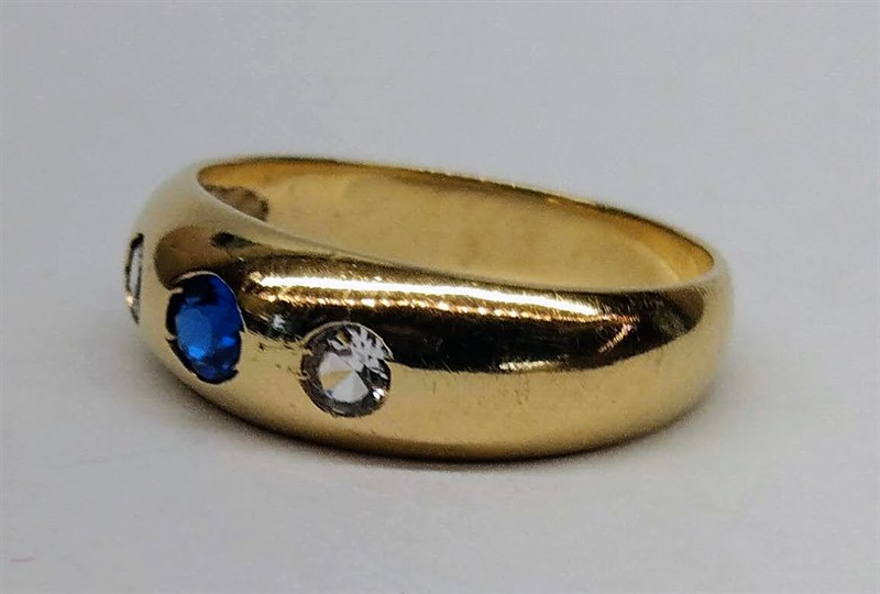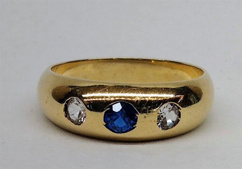 Zlatý alianční prsten se safírem a dvěma diamanty starého briliantového brusu, celkem 0,30 ct. Celková hmotnost Au 4,40 g/585/1000, osvědčení Puncovního úřadu. Německo, začátek 20. století, šířka 0,6 cm, velikost prstenu 56,5.