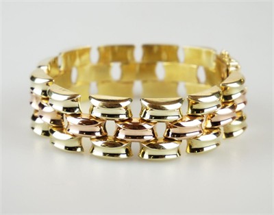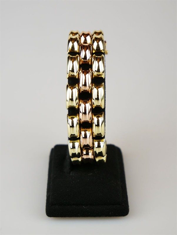 Zlatý excelentní art-deco trojřadý článkový náramek z růžového a žlutého zlata. Celková hmotnost Au 43,03 g/585/1000, dovozový punc Slovenského státu. Republika Československá, 30. léta 20. století, perfektní stav, délka 19,5 cm, šířka 1,9 cm.