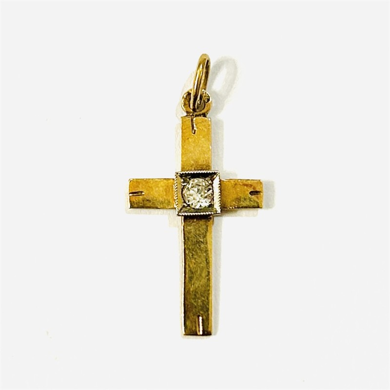 Decentní, art-deco přívěšek v podobě latinského kříže, ve středovém čtvercovém zrnitém lůžku z bílého zlata osazeno leukosafírem kulatého brusu, ramena při závěru s rytou linií. Tuzemská zlatnická práce z 30. let 20. století Zhotoveno z narůžovělého žlutého 14 karátového zlata, tj. o ryzosti 585/1000; prvorepublikový punc Z-45 (český lev 4) a mistrovská značka na oušku. Hmotnost 0,76 g, celková délka 25 mm, šířka 11,5 mm. Ponecháno s přirozenou patinou, lze vyčistit, celkově v zachovalém stavu.