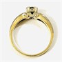 Elegantní, zářivý prsten osazen ve čtvercové koruně přírodním diamantem kulatého briliantového brusu o hmotnosti 0,33 ct, čistota VS1, barva K-L, po stranách doplněno přírodními diamanty kulatého jednoduchého brusu (achtkant) o váze 0,14 ct (0,023 ct - 6 ks), jež jsou dobré kvality, celková hmotnost kamenů 0,47 ct. Fasováno v lůžkách z bílého zlata, centrální koruna opatřena zdobnými průsvitkami. Šperk zásnubního typu v doznívajícím stylu art-deco, kvalitní západoevropská klenotnická práce z 50. let 20. století. Zhotoveno ze žlutého 14 karátového zlata, tj. o ryzosti 585/1000; vyhotoveno osvědčení puncovního úřadu, ryzostní číslo zevnitř šíny. Hmotnost 4,15 g, velikost 56,5, šířka hlavice 5 mm. Velikost v minulosti upravována, celkově ve velmi zachovalém stavu. Součástí odborný posudek.