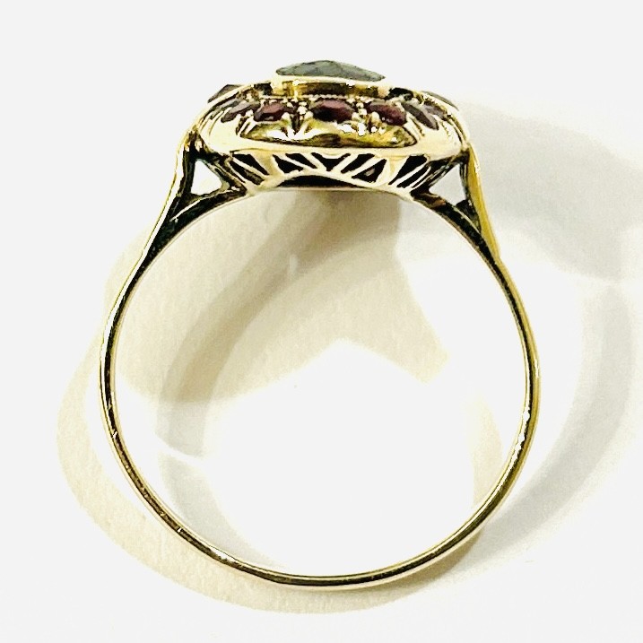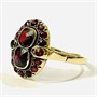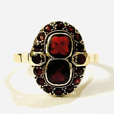 Elegantní prsten z období art-deco, geometricky stavěná oválná hlavice osazena českými granáty, 2 centrální obdélného šachovnicového brusu (o nadstandardním rozměru téměř 5 mm), drobné kulatého brusu. Fasováno obrubou, opatřeno průsvitkami. Precizní tuzemská klenotnická práce z 30. let 20. století. Zhotoveno ze žlutého 14 karátového zlata, tj. o ryzosti 585/1000; nově opatřeno puncem Z-58 (labuť 4) a nečitelné původní značení zevnitř šíny. Hmotnost 2,64 g, velikost 54, délka hlavice 15 mm. Stopy nošení, celkově v dobrém stavu, odborně vyčištěno a vyleštěno zlatníkem.