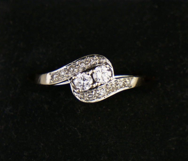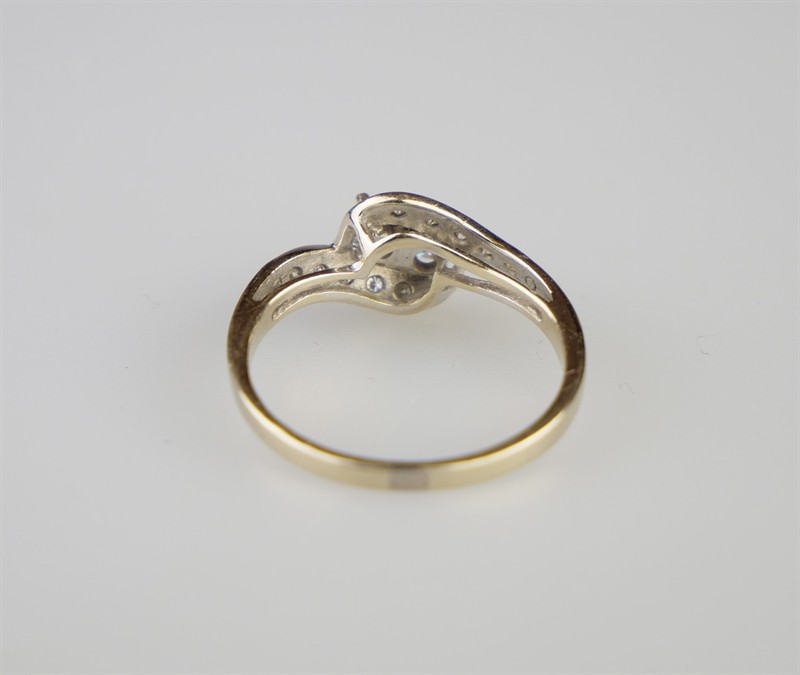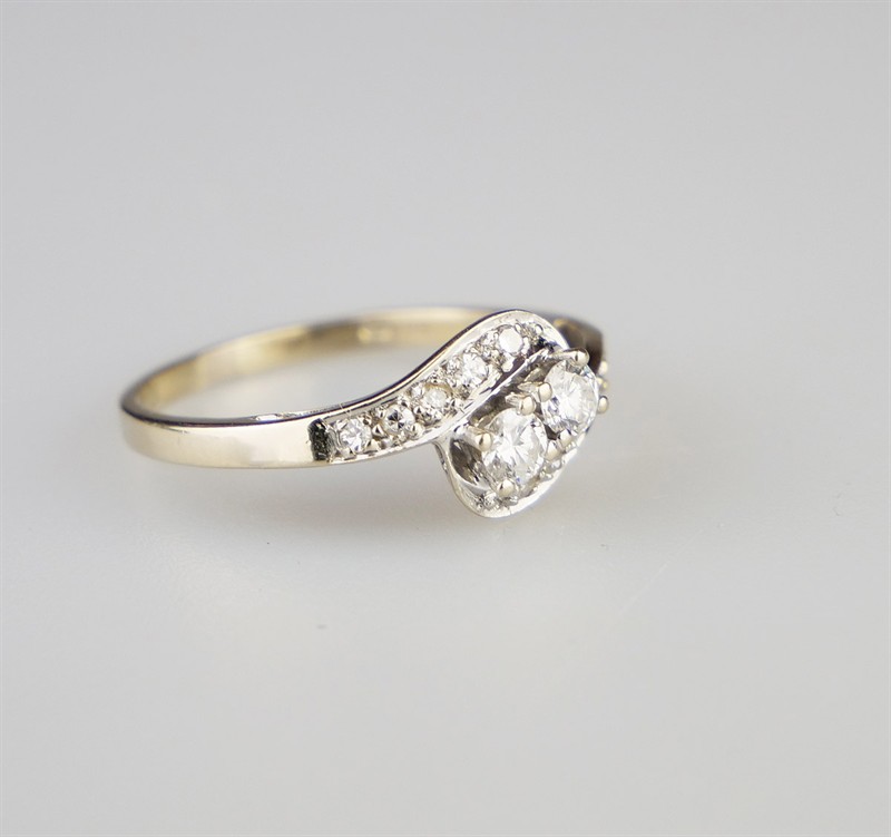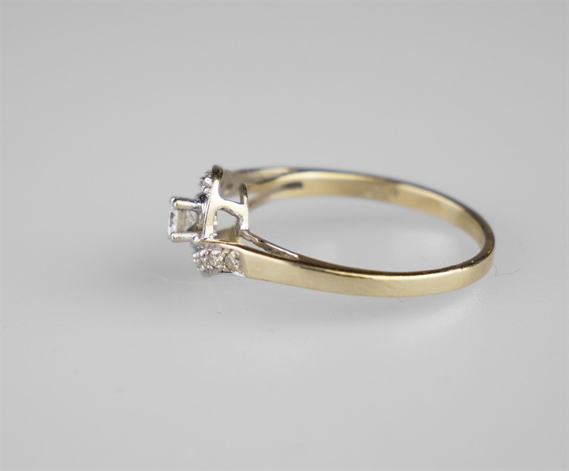 Zlatý art-deco prsten s diamanty, 14 diamantů o hmotnosti 0,52 ct, barva H-I, kvalita VS-SI. Celková hmotnost Au 2,50 g/585/1000, osvědčení Puncovního úřadu. Západní Evropa, první třetina 20. století, velikost prstenu 56