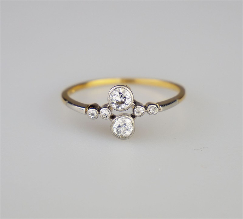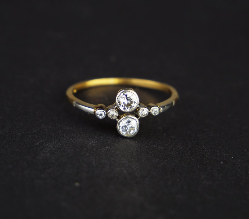 Zlatý art-deco prsten s diamanty, hmotnost 6 diamantů briliantového brusu 0,47 ct, barva H-I, kvalita SI. Celková hmotnost Au 2,05 g/585/1000, osvědčení Puncovního úřadu. Západní Evropa, první třetina 20. století, velikost prstenu 57,5
