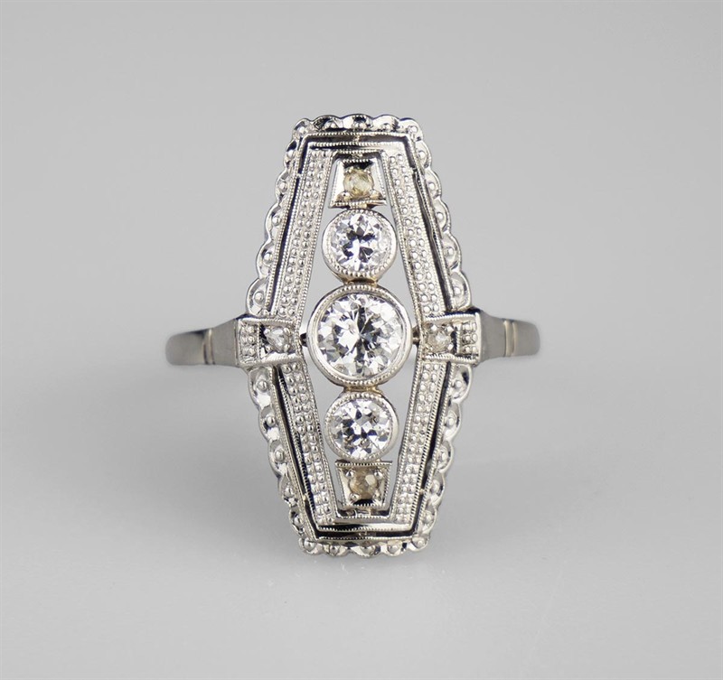 Zlatý art-deco prsten s diamanty briliantového a routového brusu, celkem 0,30 ct, barva I-J, kvalita SI. Celková hmotnost Au 2,85 g/585/1000, punc. Západní Evropa, první třetina 20. století, velikost prstenu 56