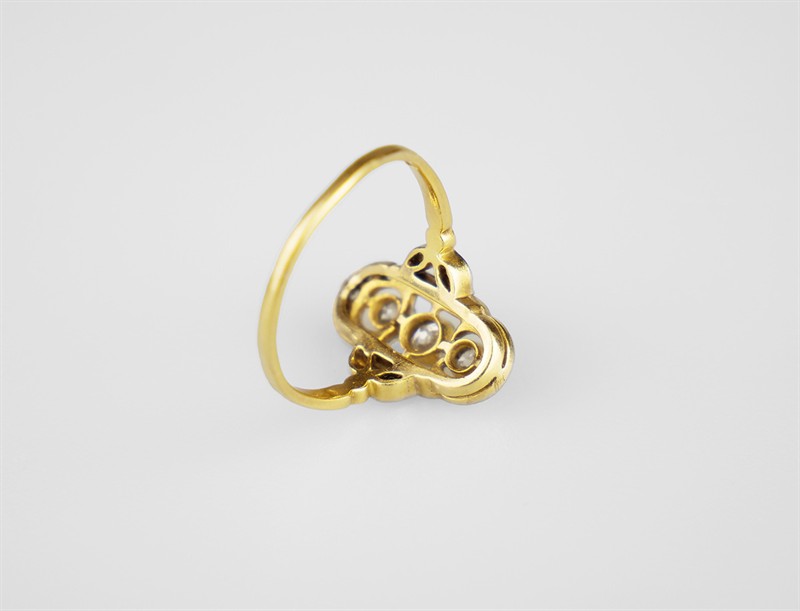 Zlatý art-deco prsten s diamanty briliantového a routového brusu, celkem 0,30 ct, barva I-J, kvalita SI. Celková hmotnost Au 2,55 g/585/1000, punc. Západní Evropa, první třetina 20. století, velikost prstenu 50
