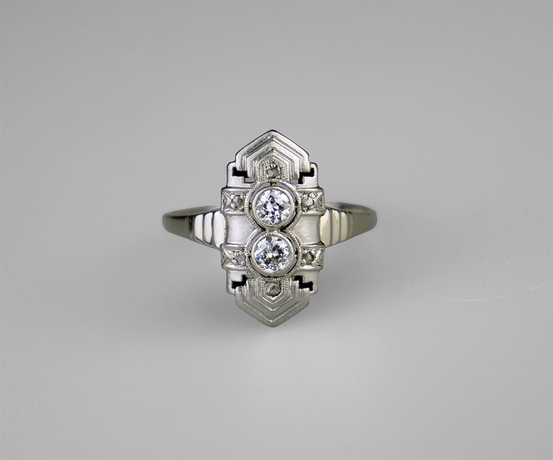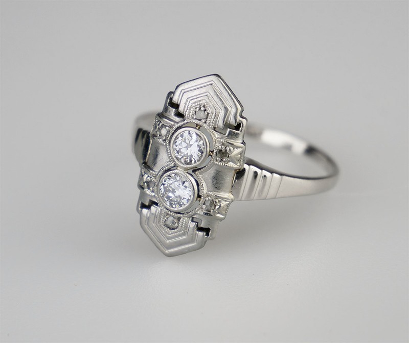Zlatý art-deco prsten s 8 diamanty briliantového a routového brusu, celkem 0,30 ct, barva I-J, kvalita VS-SI. Celková hmotnost Au 2,25 g/585/1000, punc. Republika Československá, první třetina 20. století, velikost prstenu 58.