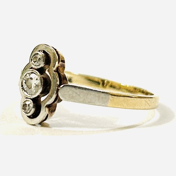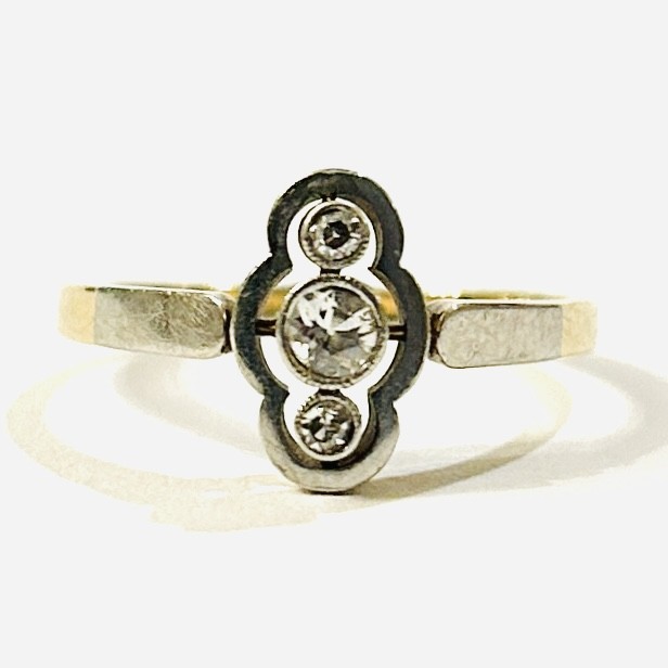 Elegantní, decentní prsten z období art-deco, prořezávaná hlavice osazena 3 přírodními diamanty starého briliantového a kulatého jednoduchého (achtkant) brusu, o celkové váze cca 0,13 ct, velmi dobrá kvalita. Fasováno zrnitými obrubami v kontrastním bílém kovu přesahující do ramen šíny, hlavice s obloukovými průsvitkami. Německá klenotnická práce z 20. až 30. let 20. století. Zhotoveno ze žlutého 14 karátového zlata, tj. o ryzosti 585/1000, ramena šíny a kameny uloženy v platině o ryzosti 900/1000; vyhotoveno osvědčení puncovního úřadu, ryzostní číslo zevnitř šíny. Hmotnost 2,00 g, velikost 53, délka hlavice 10 mm. Ponecháno s jemnou přirozenou patinou, lze vyčistit, celkově v zachovalém stavu.