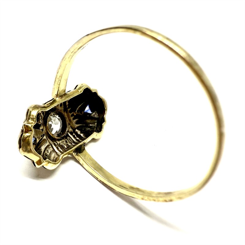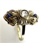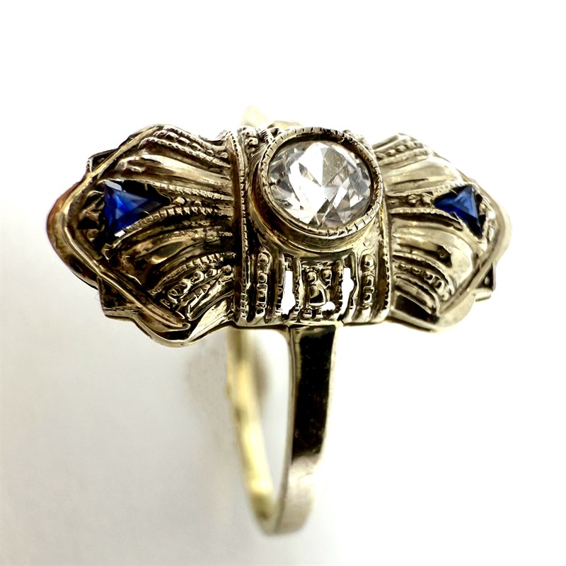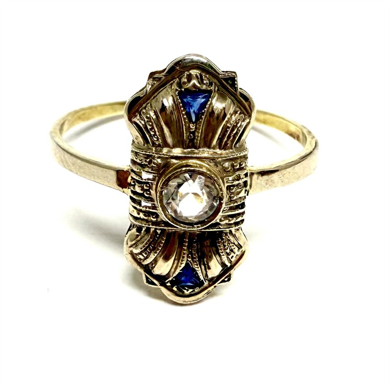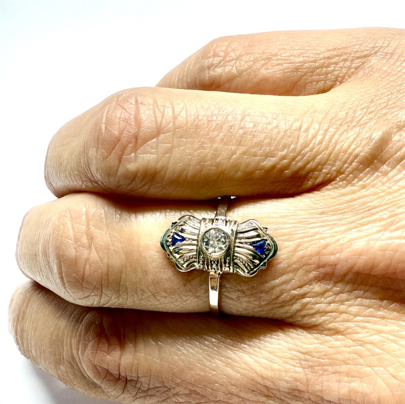 Půvabný zlatý prsten zhotovený v první polovině 20.století ze 14ti karátového zlata ve stylu Art deco. Šperk zdobí jeden bílý, středový safír a dva drobné tmavě modré safíry. Celková váha 1,36 g. Velikost 52,5. Perfektní stav.