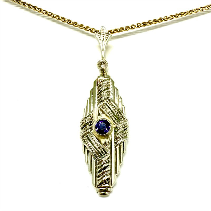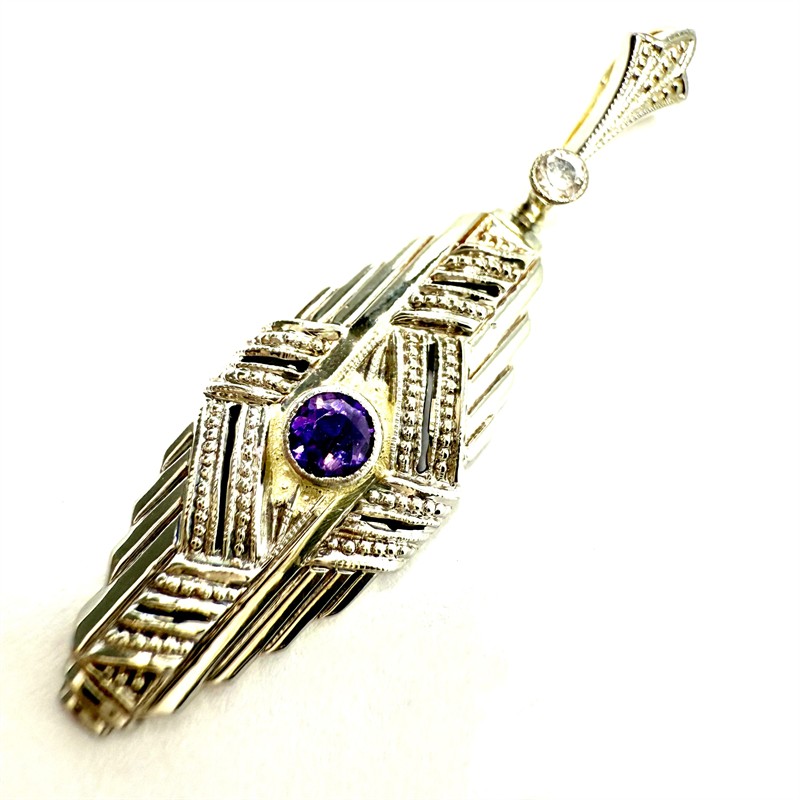 Půvabný, elegantní závěs zhotovený v první polovině 20.století ve stylu Art deco. Šperk byl vyroben v barevné kombinaci bílého a žlutého zlata. V centrální části je osazen ametystem a u závěsu leukosafírem. Zlato ryzosti 585/1000, celková váha 1,00 g. Rozměry 3,7 x 1 cm. Perfektní stav. Řetízek není součástí prodeje.