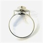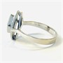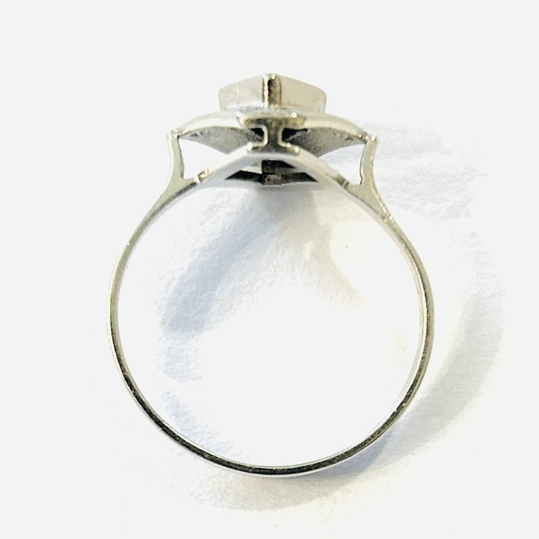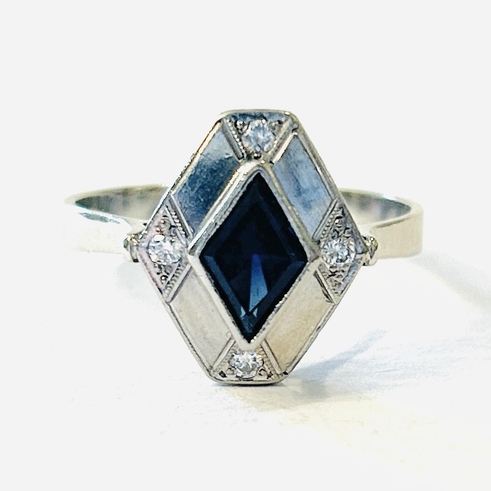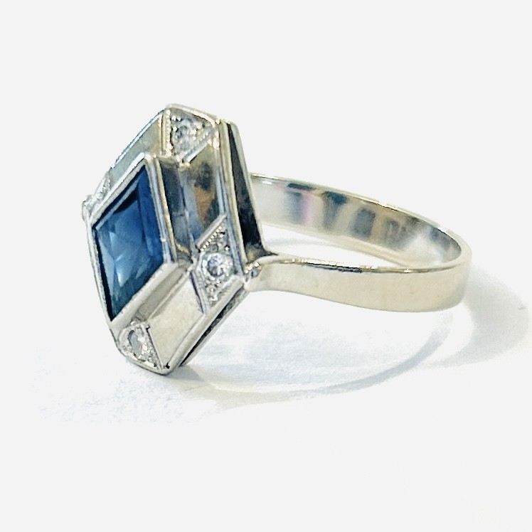 Elegantní prsten stylově čerpající z estetiky období art-deco, uprostřed osazeno syntetickým modrým safírem plochého kosodélného brusu, při vrcholech decentně zdobeno přírodními diamanty kulatého briliantového brusu o celkové váze cca 0,10 ct (0,025 ct - 4 ks), jež jsou velmi dobré kvality. Centrální kámen fasován ve vyvýšené zrnité obrubě, hlavice geometricky členěna rytím a zrnkováním. Tuzemská ateliérová práce z přelomu 20. a 21. století. Zhotoveno z bílého 14 karátového zlata, tj. o ryzosti 585/1000; punc Z-58 (labuť 4), ryzostní číslo a mistrovská značka „OPA“ zevnitř šíny. Hmotnost 3,54 g, velikost 59, délka hlavice 14 mm, šířka 12 mm. V zachovalém stavu, odborně vyčištěno.