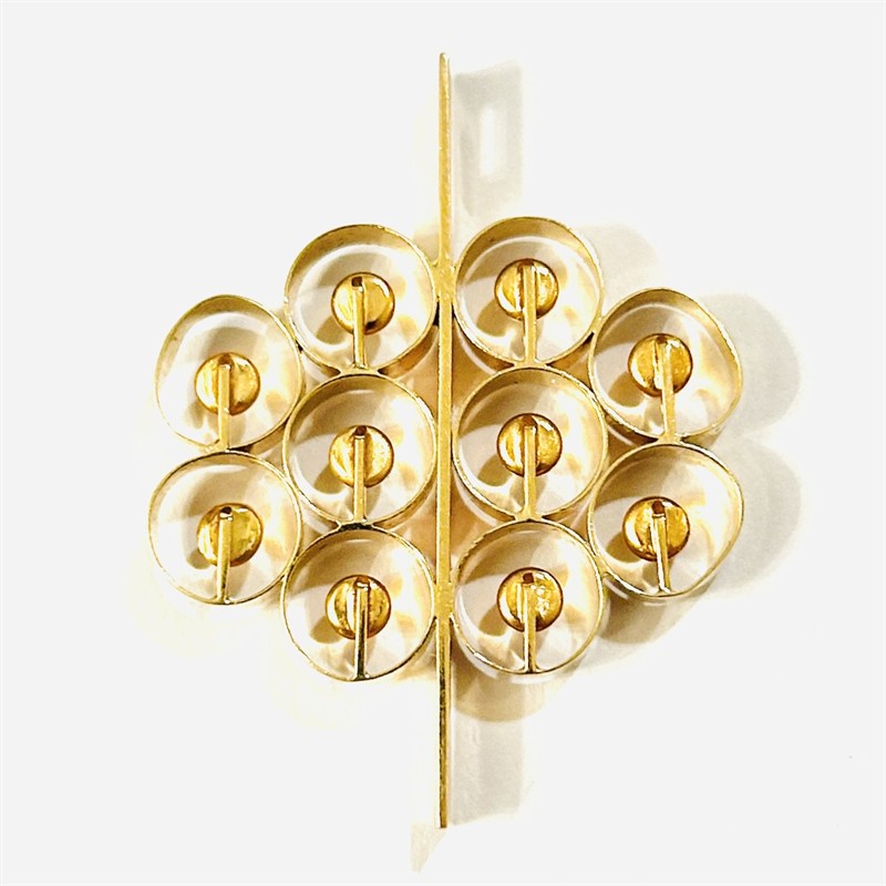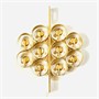 Větší, designový přívěšek, tělo tvořeno podélnou osou se shlukem kulatých buněčných článků osazených ve středu vysokými kulatými muglemi přírodních medových citrínů. Severský, minimalistický design blízký bruselskému stylu. Precizní provedení z dílen finské (Helsinky) klenotnické firmy Kaunis Koru z roku 1963. Sběratelsky zajímavé. Zhotoveno z narůžovělého žlutého 14 karátového zlata, tj. o ryzosti 585/1000; vyhotoveno osvědčení puncovního úřadu, finský punc "koruna", datační značení "K7", ryzostní číslo a značky výrobce z boku. Hmotnost 6,23 g, délka 43,5 mm, šířka 33 mm. Boční stěny lehce deformované, jinak v dobrém stavu, odborně vyčištěno a vyleštěno.